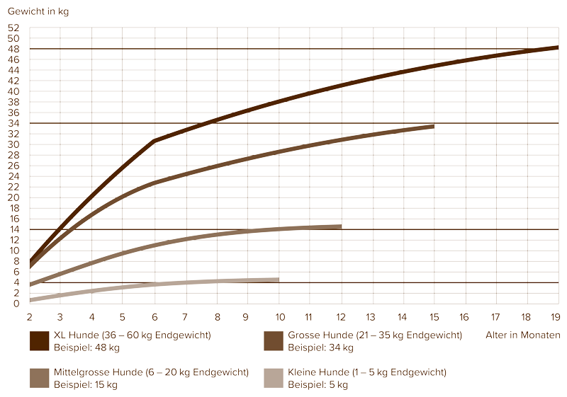 Non si deve nutrire un cane con cibo per cani adulti fino a quando il cane non è completamente cresciuto. Le razze piccole sono completamente sviluppate a circa 10 mesi di età, le razze medie a 12 mesi e le razze grandi e giganti a circa 18-24 mesi. Nel primo semestre si verifica il maggior aumento di peso e di dimensioni. Per informazioni più dettagliate, chiedi all'allevatore o all'associazione della razza le fasi di crescita del giovane cane.
